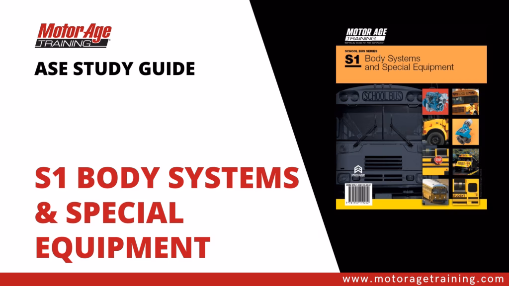 Prepare for your ASE S1 Body Systems and Special Equipment certification with Motor Age Training’s complete study program. Updated for 2024, this guide is designed to help school bus technicians build the knowledge and confidence needed to pass the ASE S1 exam and excel in real-world service situations. With clear explanations and dozens of helpful illustrations, it connects theory to practical applications found in the field.